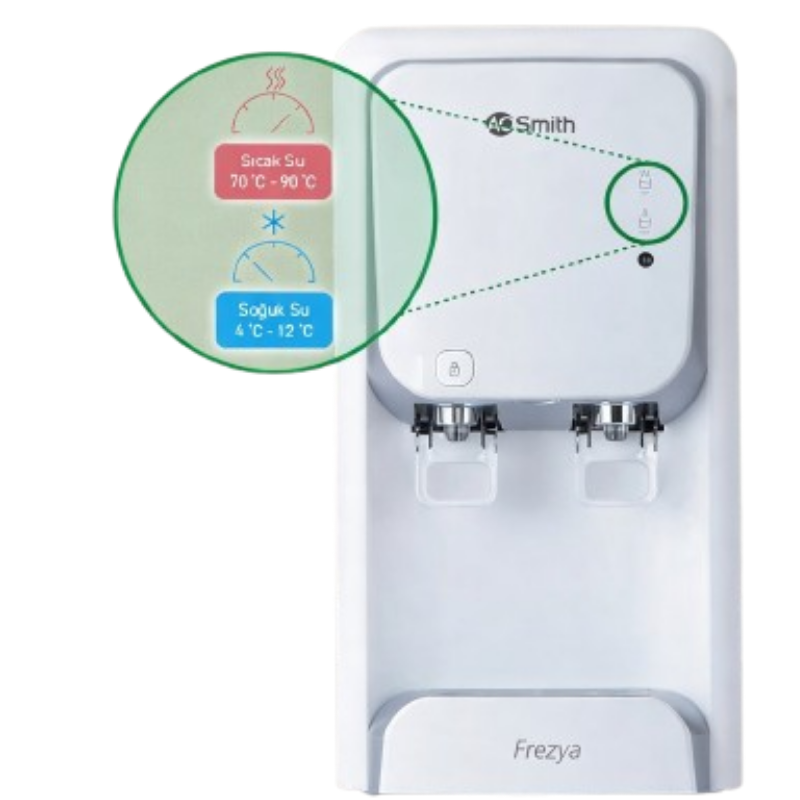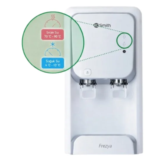 A.O. Smith Frezya TU Tezgah Üstü Arıtmalı Sebil, musluk suyunu dahili arıtma sistemiyle güvenle içilebilir hale getirir. Sıcak ve soğuk su seçenekleri sayesinde ev ve ofisler için maksimum kullanım kolaylığı sunar.